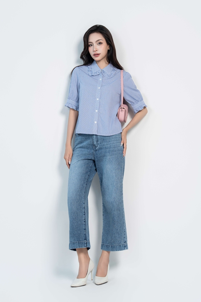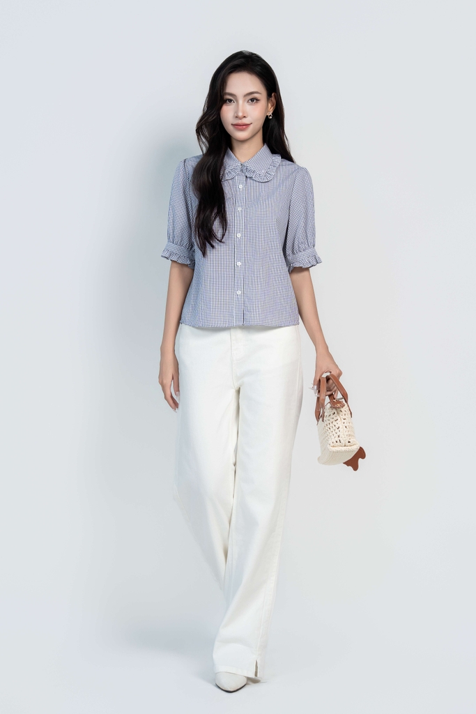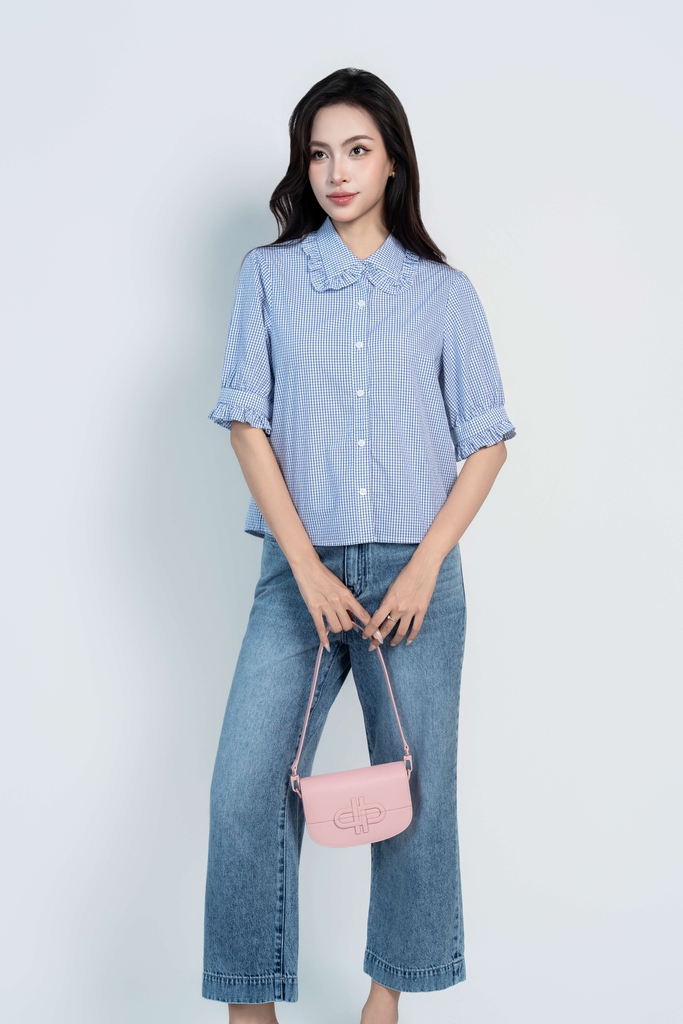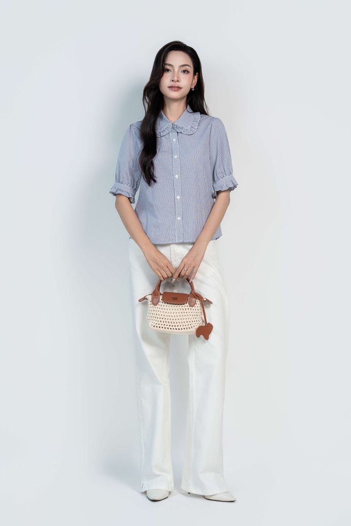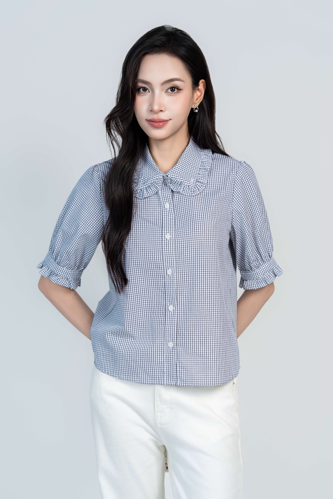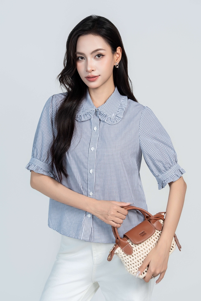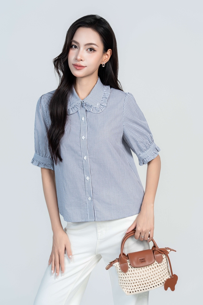 - Thiết kế cổ và tay áo có bèo nhúm độc đáo cùng với họa tiết kẻ caro nhỏ tinh tế giúp tôn lên nét đpự nhẹ nhàng, hiện đại |