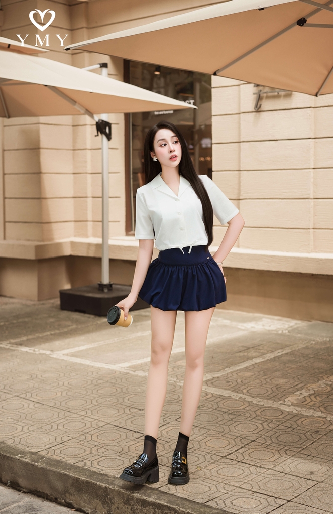 - Thiết kế dáng chữ A ngắn trẻ trung, form bí ngô lạ mắt giúp tôn dáng và hack tuổi |